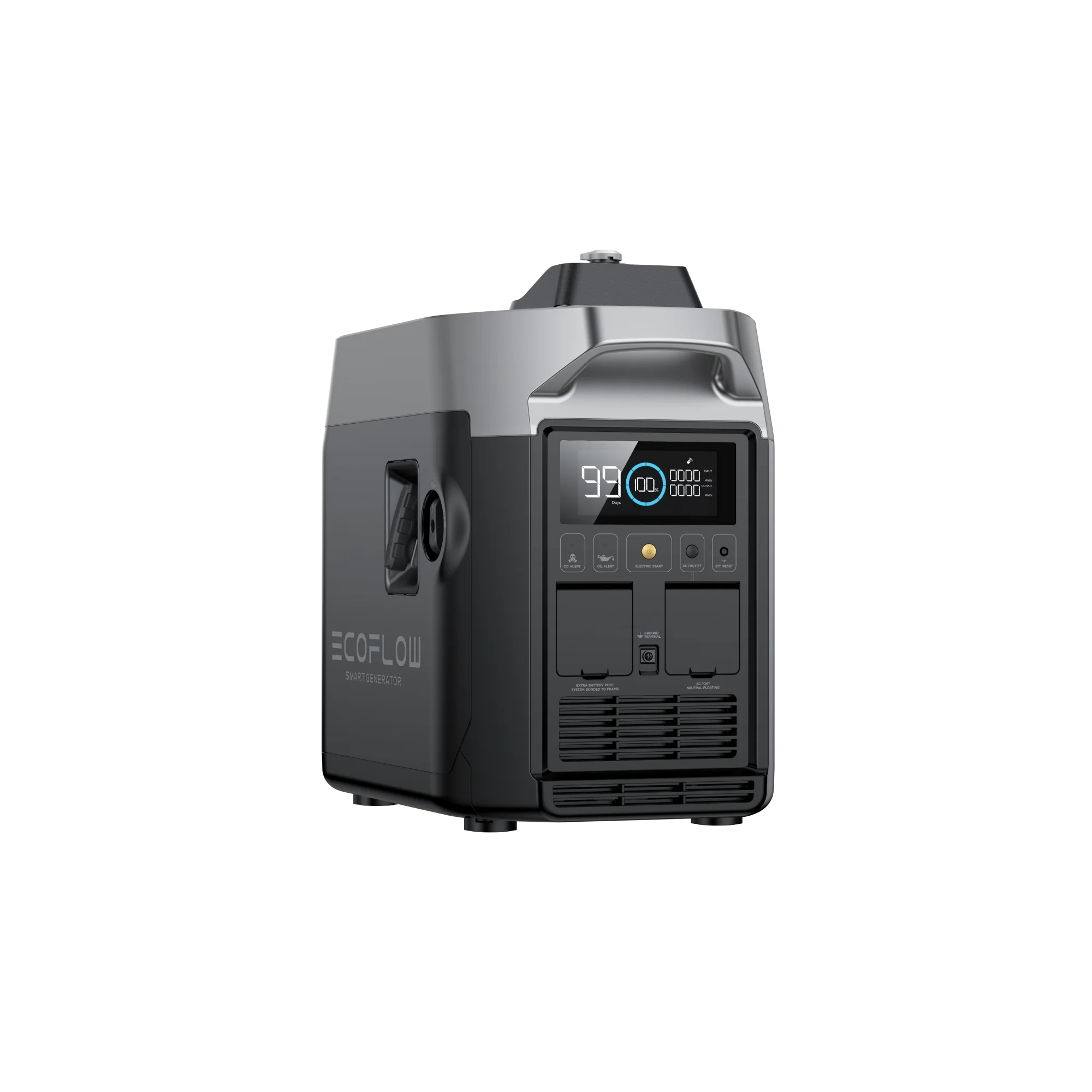 The EcoFlow Smart Generator simplifies emergency power, featuring an LCD screen, CO alert, fuel alert, and an auto shutdown – giving you everything you need to stay safe during a power outage or emergency.