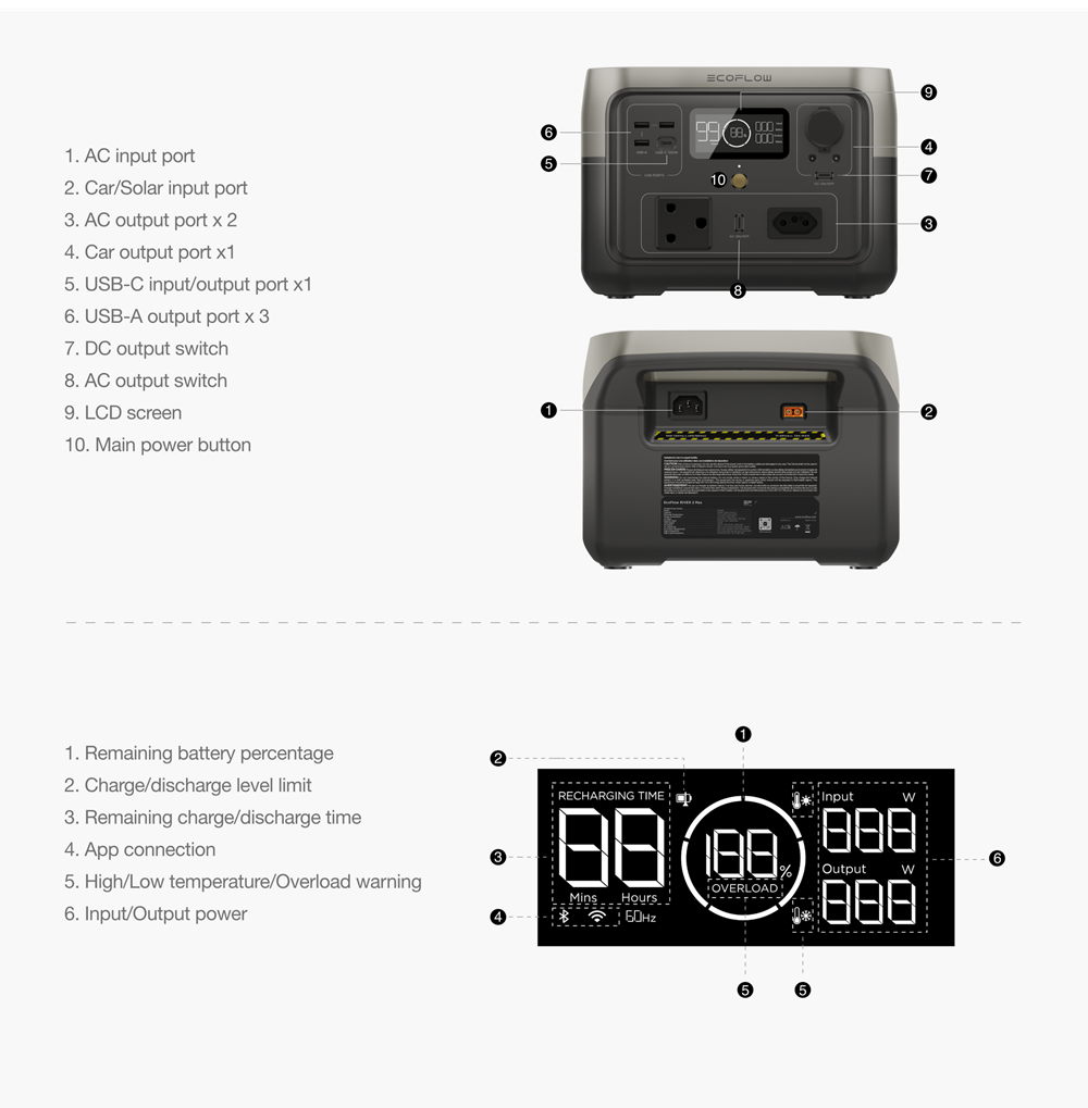 The RIVER 2 Max integrates Wi-Fi and Bluetooth control via the EcoFlow app, allowing users to monitor battery levels, charging state, and device usage remotely. Built-in safety features protect against over-voltage, overheating, over-current, and short circuits, ensuring both the station and your devices remain safe during operation.